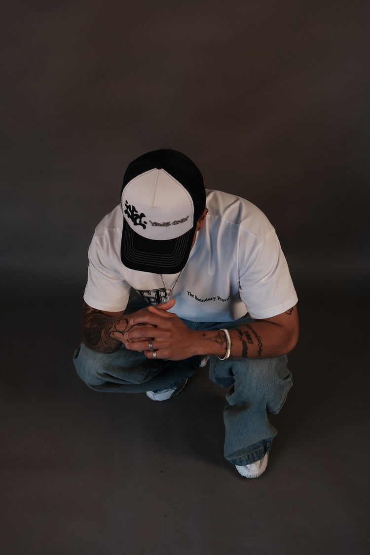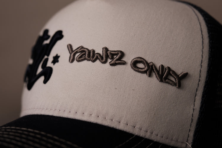 Two Tone Trucker hat. Mesh back & canvas front with white stitching details, white embroidery under the brim and reverse label on the rear. Made to be worn anywhere and everywhere.