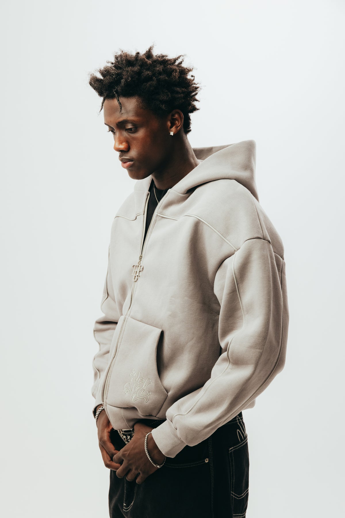 This jacket has been tailored to be a slightly boxy fit. Our french terry fabric is double layered, allowing it to keep that perfect shape but also feeling smooth on the skin.